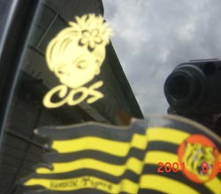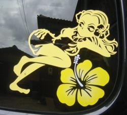 ■リヤウインドウに■ 波乗りTetsuko(顔)とmemちゃん(黄色)。